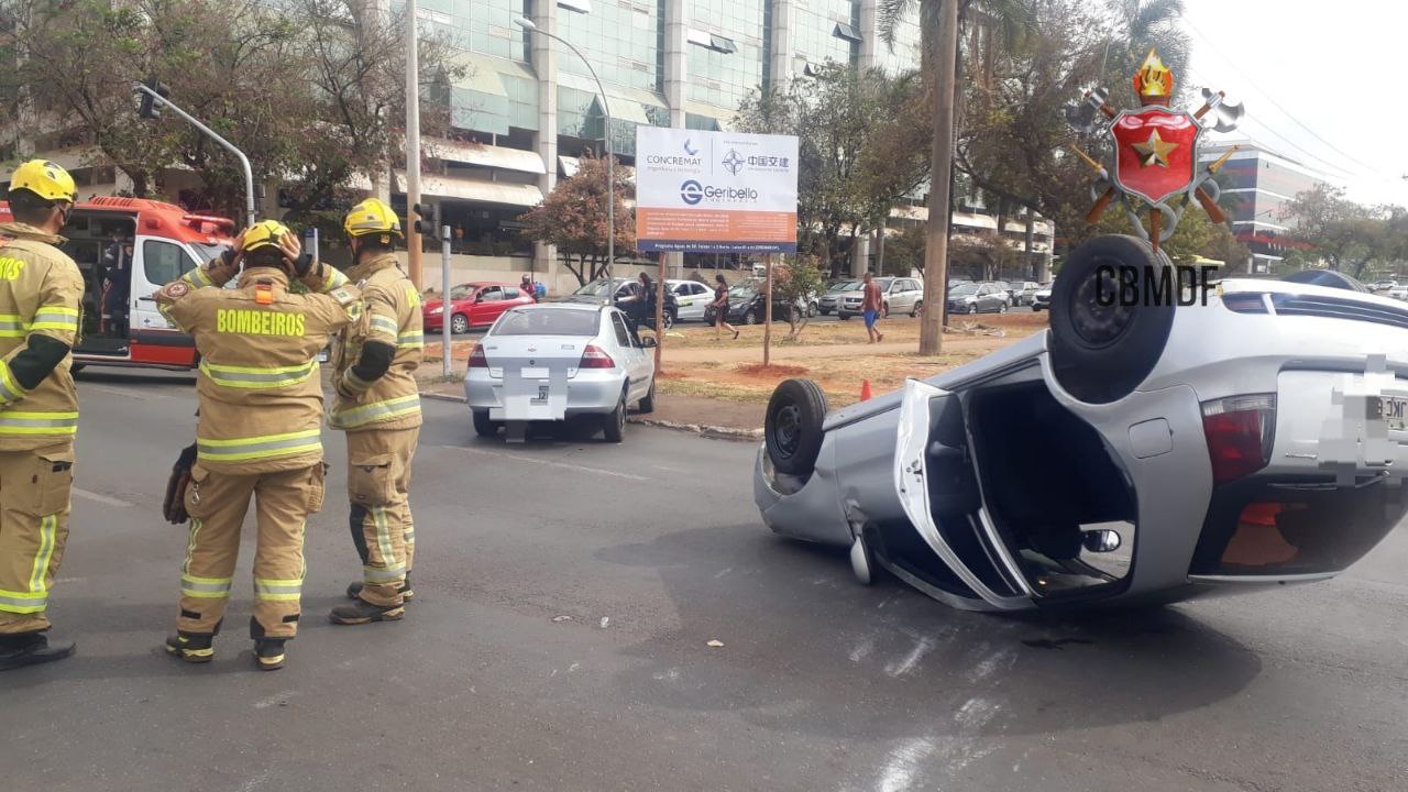 O Corpo de Bombeiros Militar do Distrito Federal (CBMDF) atendeu, na tarde desta segunda-feira (14), uma colisão entre dois carros, seguida pelo capotamento de um deles, na quadra 702 da Asa Norte, próximo ao Edifício Brasília Rádio Center.