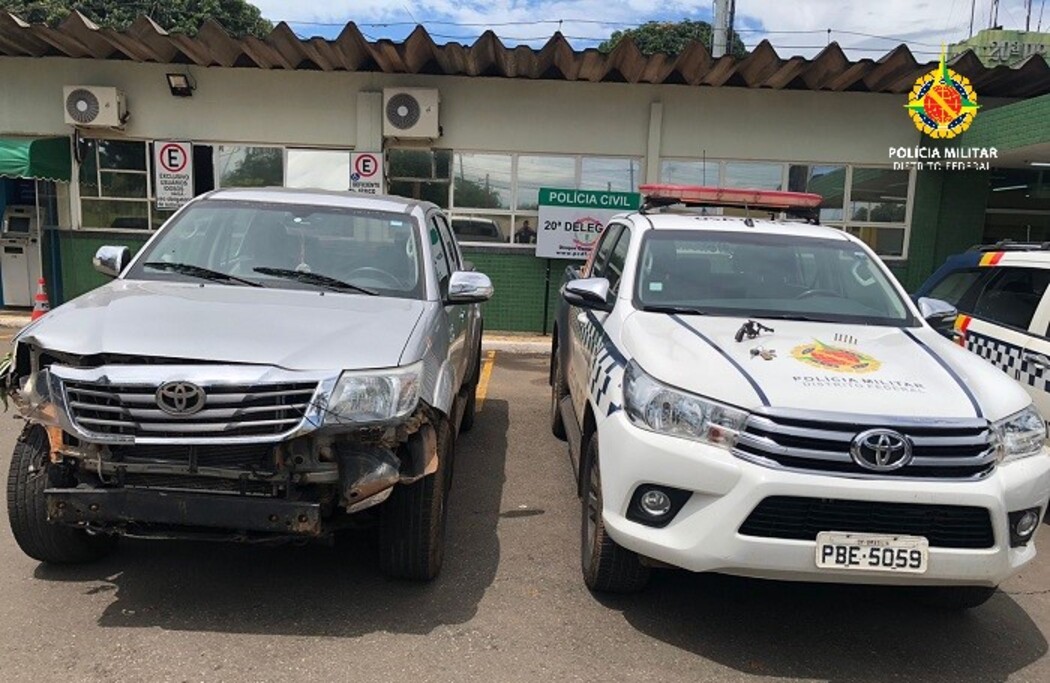 A caminhonete havia sido roubada no estacionamento de um supermercado no Novo Gama (GO). Ao avistarem o veículo próximo ao condomínio, a equipe deu ordem de parada, mas os suspeitos tentaram fugir, indo em direção a um matagal próximo à Escola Classe 01.