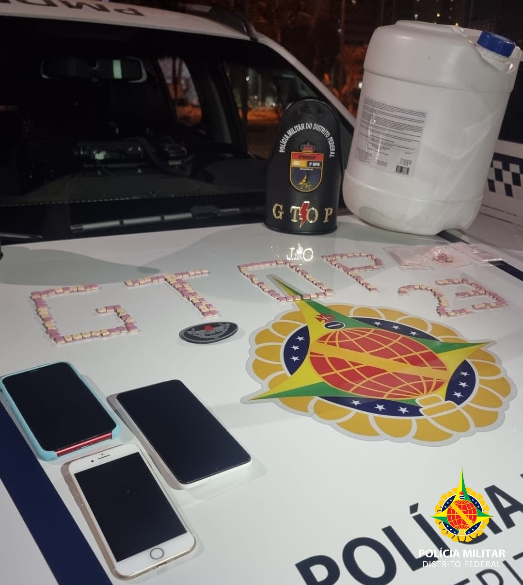 A ação foi conduzida por policiais militares do Grupo Tático Operacional do 3º Batalhão (Gtop 23), que avistaram a dupla em um veículo agindo de forma suspeita e decidiram realizar a abordagem. Durante a revista no carro, os policiais encontraram uma grande quantidade de drogas: 200 comprimidos de Ecstasy e um galão contendo 20 litros de lança perfume.