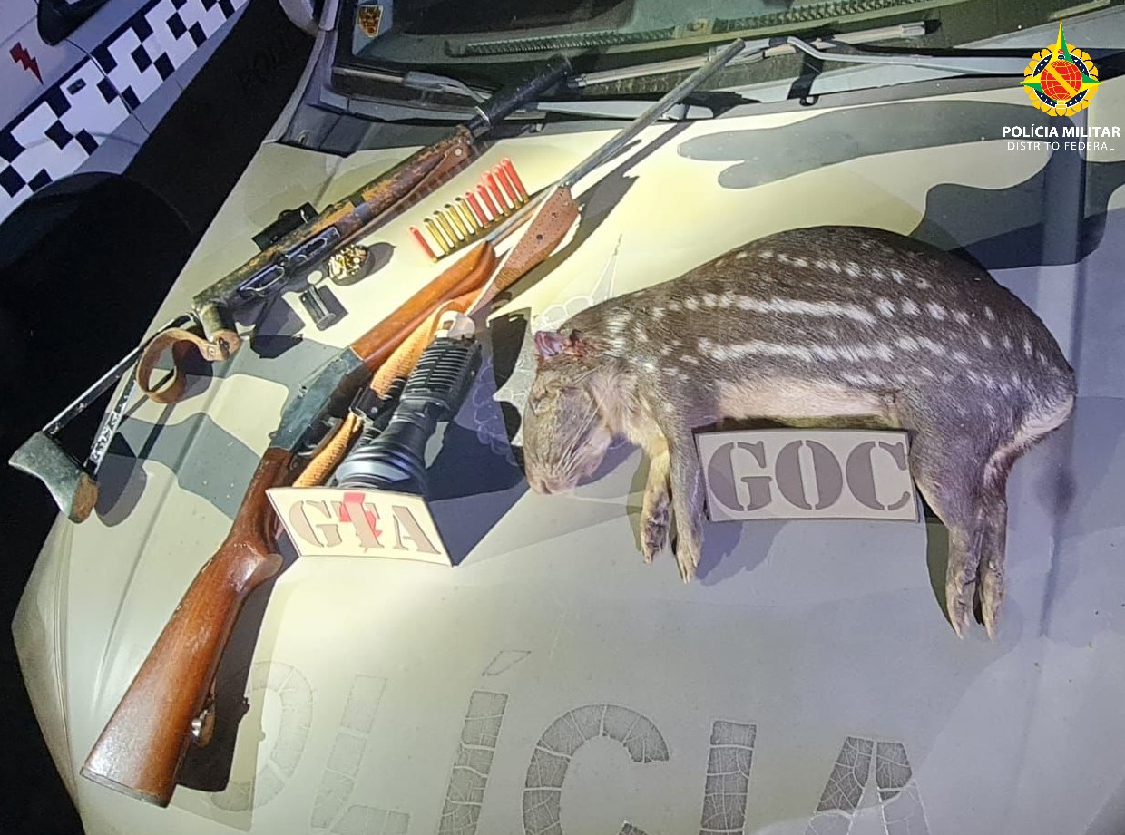 Na tarde desta segunda-feira (22), a Polícia Militar realizou a prisão de dois homens por porte ilegal de arma de fogo e crime contra a fauna. A ação conjunta contou com equipes do Grupamento de Operações no Cerrado (GOC), Grupo Tático Ambiental (GTA) e o Batalhão de Policiamento com Cães, que estavam em um ponto de bloqueio na DF 250.