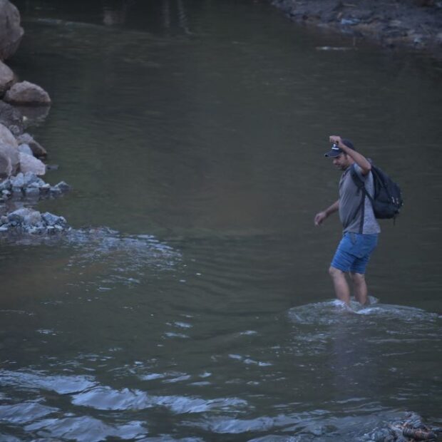 Outro morador da região que faz o mesmo trajeto é Marcondes Lopes, que trabalha com obras e precisa sair cedo de casa para o serviço. Ele retorna no fim do dia, no crepúsculo, e realiza o mesmo ritual: tira as botas e a meia do trabalho, sobe a barra da calça até o joelho e começa a caminhar no córrego até o outro lado. “Assim fica mais perto”, comentou. “Pego esse atalho aqui para não precisar fazer o arrodeio todo.”