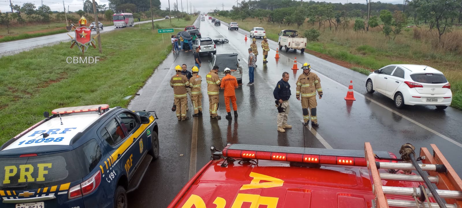 O Corpo de Bombeiros Militar do DF atendeu a ocorrência com três viaturas e 14 militares, que fizeram com a vítima, o único ferido do acidente, o protocolo de trauma. O motociclista apresentou fratura no membro inferior esquerdo e estava com suspeita de fratura na região pélvica. Depois de imobilizado, ele foi transportado ao Hospital Regional de Sobradinho.