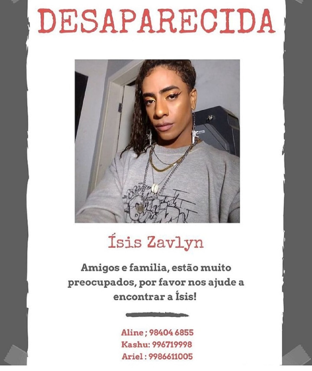 “Amigos e família estão muito preocupados, por favor nos ajude a encontrar a Ísis”. Qualquer informação sobre a desaparecida pode ser passada para a polícia ou nos números 984046855 (Aline), 996719998 (Kashu) e 986611005 (Ariel)