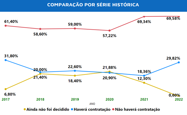 No ano passado, a previsão foi superada. Pesquisa pré-contração registou que 18,36% planejavam aumentar a quantidade de vendedores, mas o resultado do pós-venda revelou que a taxa atingiu 22,02%. No total, em 2021 foram contratadas 2,1 mil pessoas – 300 a mais que o esperado.