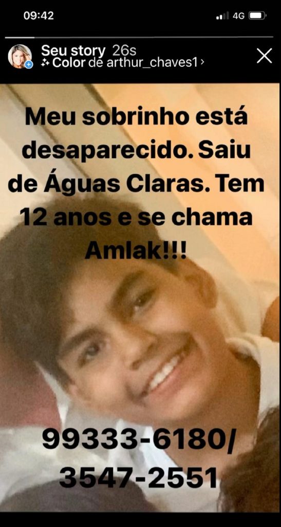 Na madrugada desta terça-feira (1º), uma criança de 11 anos desapareceu após sair de um prédio residencial, em Águas Claras. Por meio das redes sociais, familiares pedem ajuda para encontrar o menino.