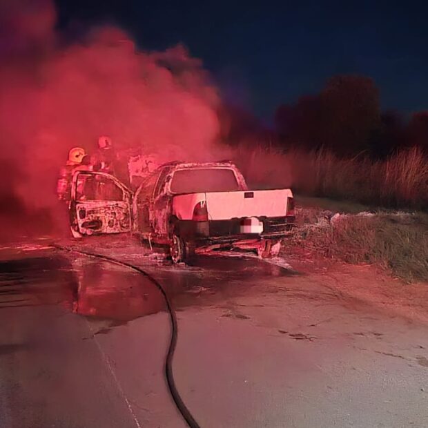 Ao chegarem ao local, os bombeiros encontraram um Fiat Strada branco em chamas, parado no acostamento da via. As equipes atuaram rapidamente, utilizando mangueiras com espuma para controlar o fogo.