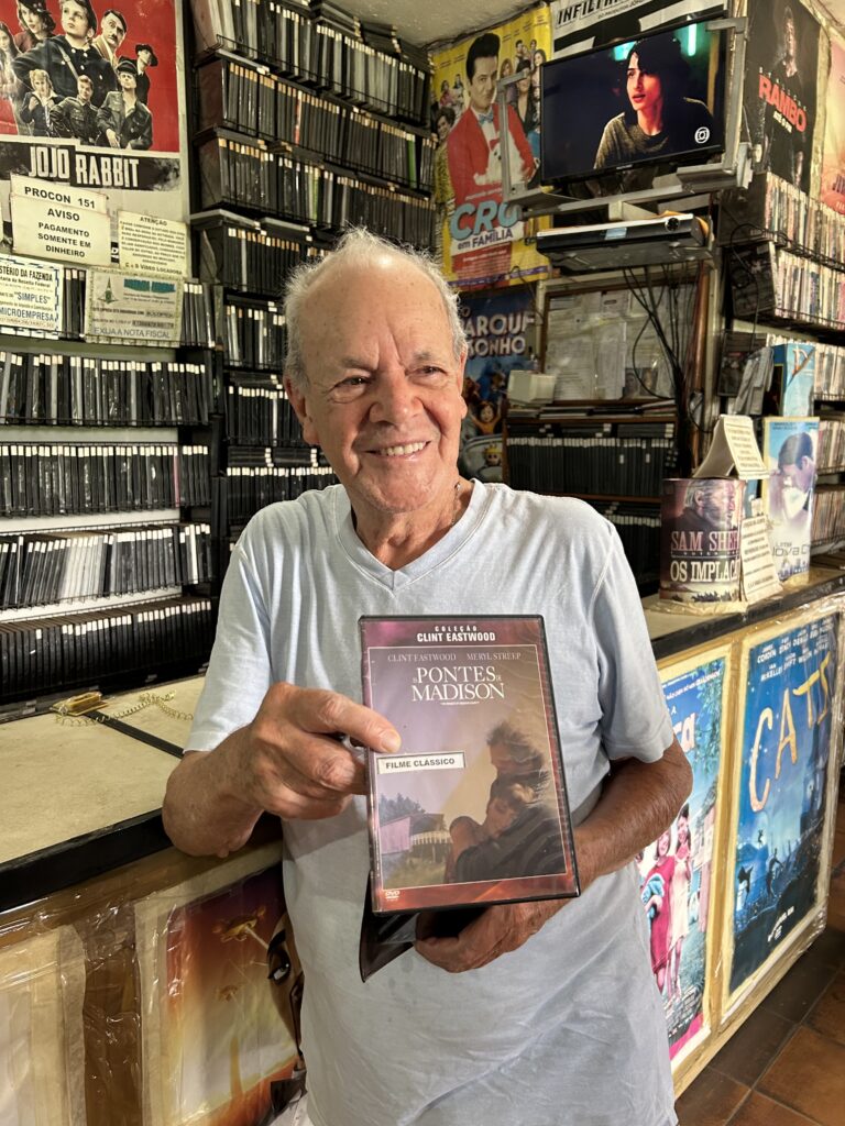 O cliente em questão é o aposentado Américo José de Castro, 91 anos, que descobriu recentemente a existência da locadora. “Senão, já seria cliente aqui há muitos anos. Eu aprendi a viver com os filmes, porque meu pai não dava educação, não tinha diálogo antigamente”, desabafa. Segundo Américo, nas plataformas de streaming não tem os filmes que ele quer ver. “E antigamente tinha mais DVD disponível para agente comprar e alugar”.