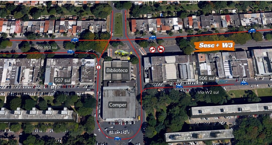 Em razão do Baile do Saruê Perfumado 2023, promovido pelo Sesc, no sábado (12) e domingo (13), das 14h às 23h, o trânsito na W3 Sul sofrerá alterações. O trecho entre a 504 e a 506 Sul, sentido norte, será bloqueado, e os veículos serão desviados para a W2 Sul, na altura do cruzamento entre a 506/507.