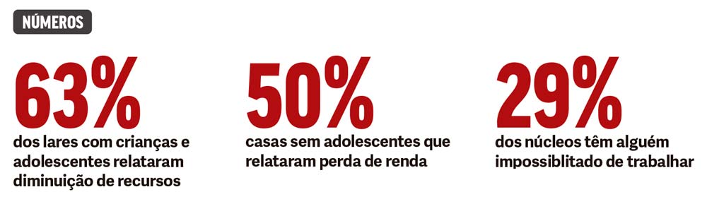 Além disso, nas famílias em que há apenas membros adultos, apenas 9% perderam mais de metade da renda, enquanto 14% perderam a metade. Já nas que possuem crianças e adolescentes os números sobrem para 10% e 25%, respectivamente.
