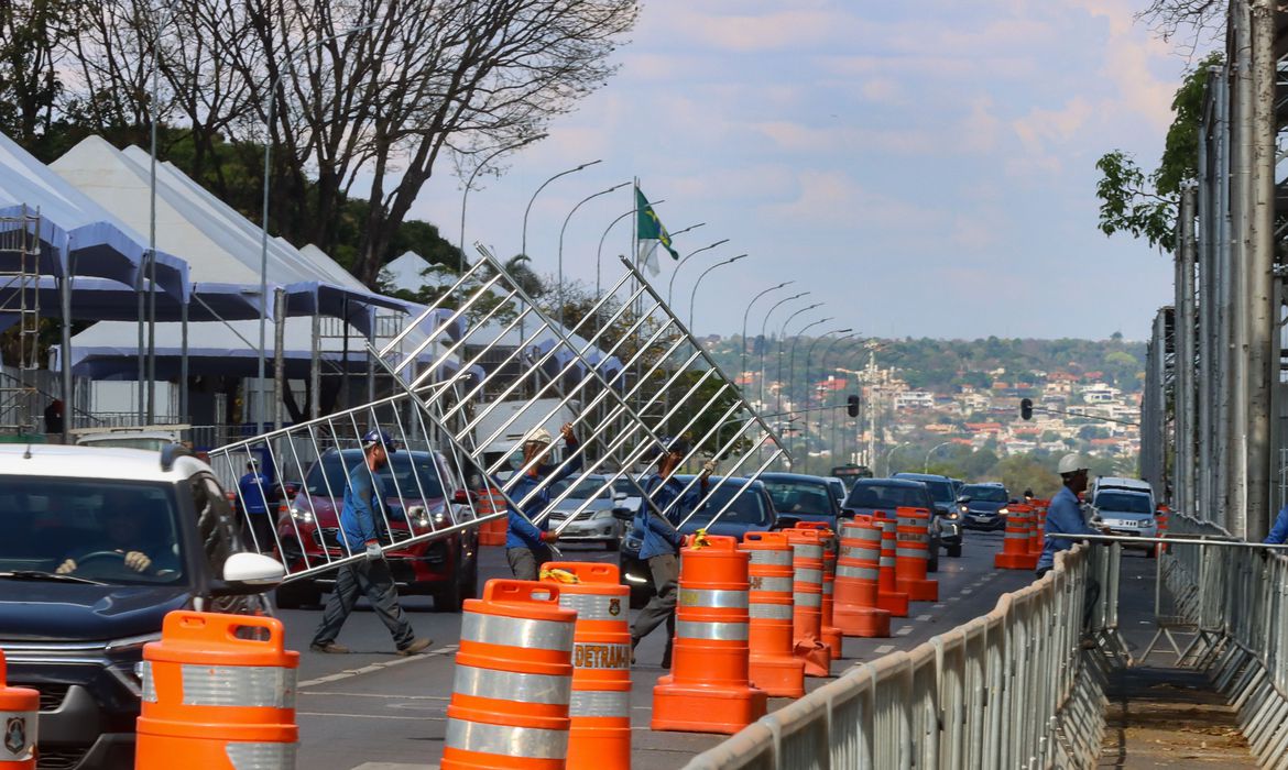 A Esplanada dos Ministérios já conta com estruturas montadas de palanques e arquibancadas, além de banneres decorativos nas fachadas dos prédios públicos.