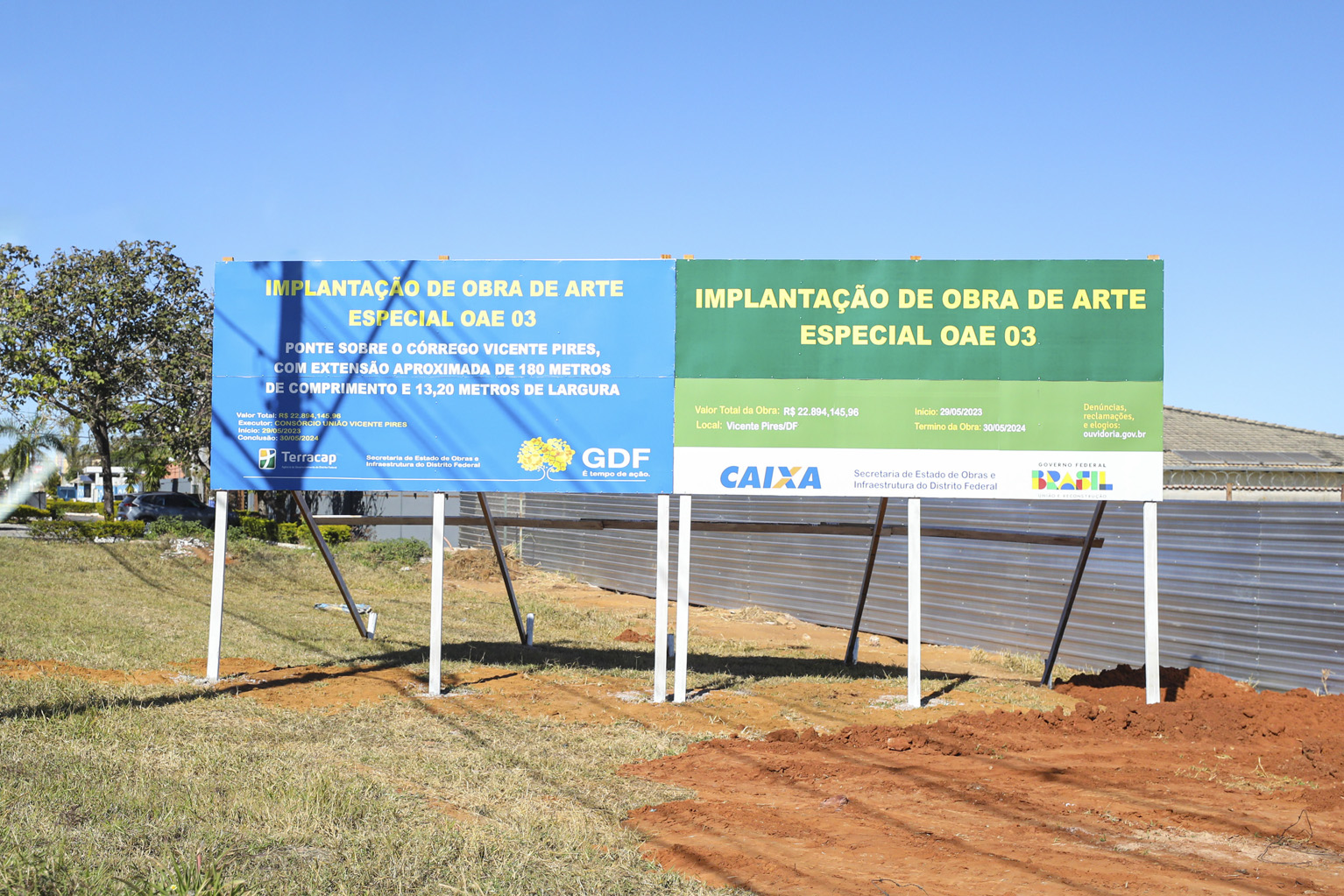 A terceira ponte a ser construída em Vicente Pires terá investimento de R$ 22,8 milhões. A Secretaria de Obras é responsável pela obra, com extensão aproximada de 180 metros e 13,20 metros de largura. O serviço compreende a execução do acesso e encabeçamento da ponte junto às ruas 1 (Jóquei) e 3B, sistema de drenagem, pavimentação, aterro em solo reforçado, sinalização horizontal e vertical, calçadas e obras complementares.