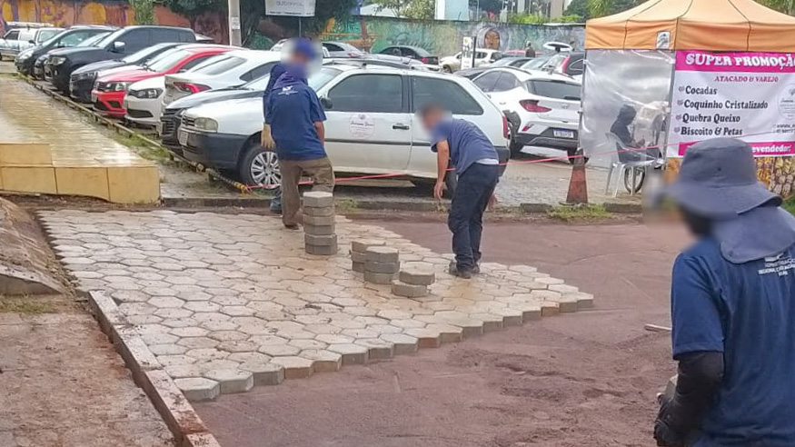 O trabalho começou na última segunda-feira (20). Toda a preparação do solo já foi feita, com serviços como terraplanagem e nivelamento, e, atualmente, a equipe de 12 pessoas atua na instalação dos bloquetes e meios-fios.