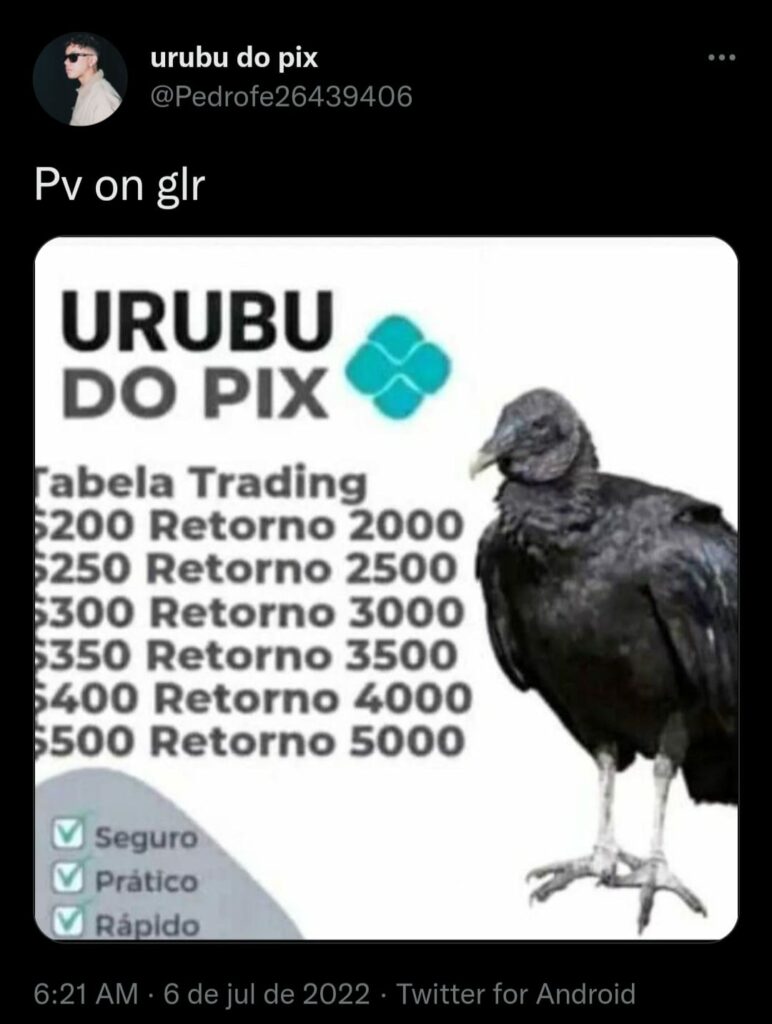 Uma categoria de golpe que vem se tornando cada vez mais popular, tem sido divulgada livremente nas redes sociais. A modalidade oferta altos valores em troca de um pequeno depósito inicial. O esquema já possui várias denominações como “Pix Premiado”, “Rei do Pix” e até “Urubu do Pix”.
