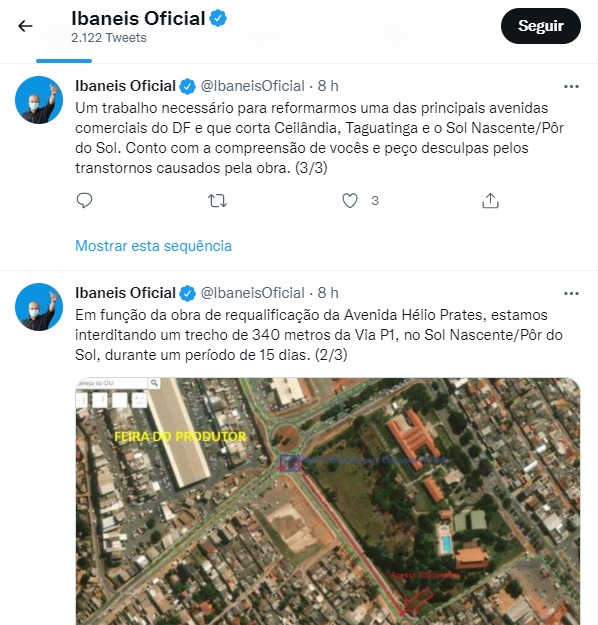 “Um trabalho necessário para reformarmos uma das principais avenidas comerciais do DF e que corta Ceilândia, Taguatinga e o Sol Nascente/Pôr do Sol. Conto com a compreensão de vocês e peço desculpas pelos transtornos causados pela obra”, diz uma das publicações de Ibaneis.