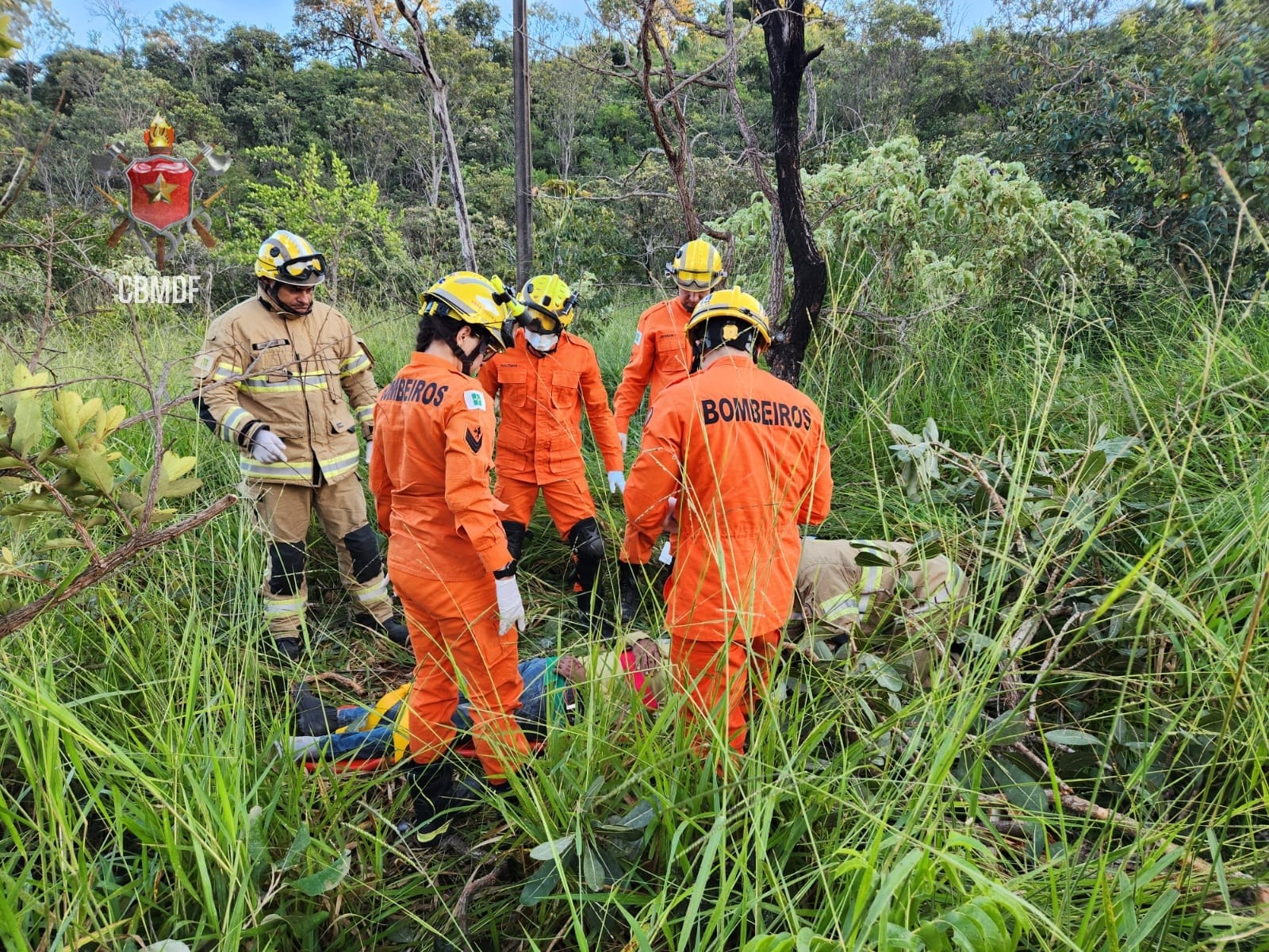 Ao chegarem ao local do acidente, os socorristas do CBMDF se depararam com um homem de 24 anos, que era o condutor do veículo FIAT/STRADA que capotou e ficou imobilizado dentro do cerrado. Ele estava caminhando pela cena do acidente com várias lesões nos membros superiores e dor no pescoço.
