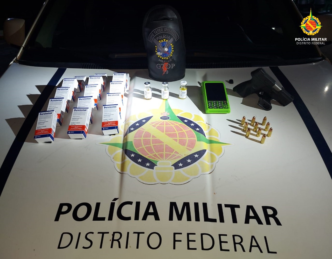 Os policias abordaram o veículo que estava o suspeito no Setor Leste do Gama. Ao vistoriarem o carro, foi encontrado 15 caixas e três frascos de anabolizantes e uma pistola calibre 9 mm com 10 munições, além de uma maquininha de cartão bancário.
