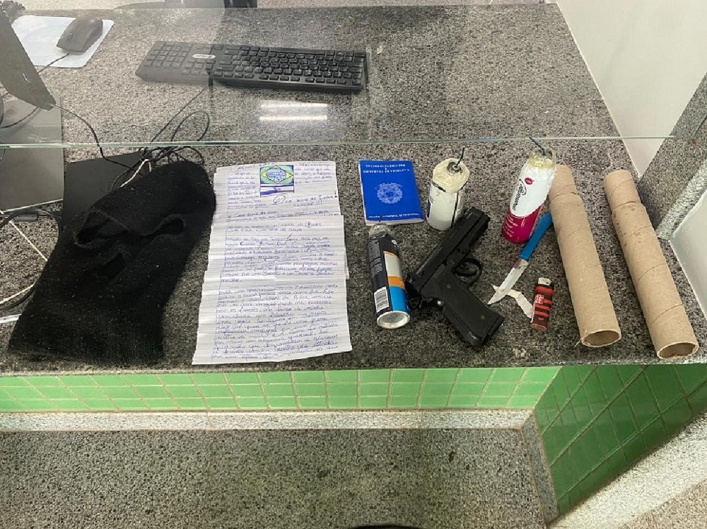 O suspeito foi abordado pelos policiais na quadra 901 e em sua mochila foram localizados três frascos de desodorantes aerossol com pavil, dois rojões explosivos, um isqueiro, um simulacro de arma de fogo, uma faca e uma balaclava.