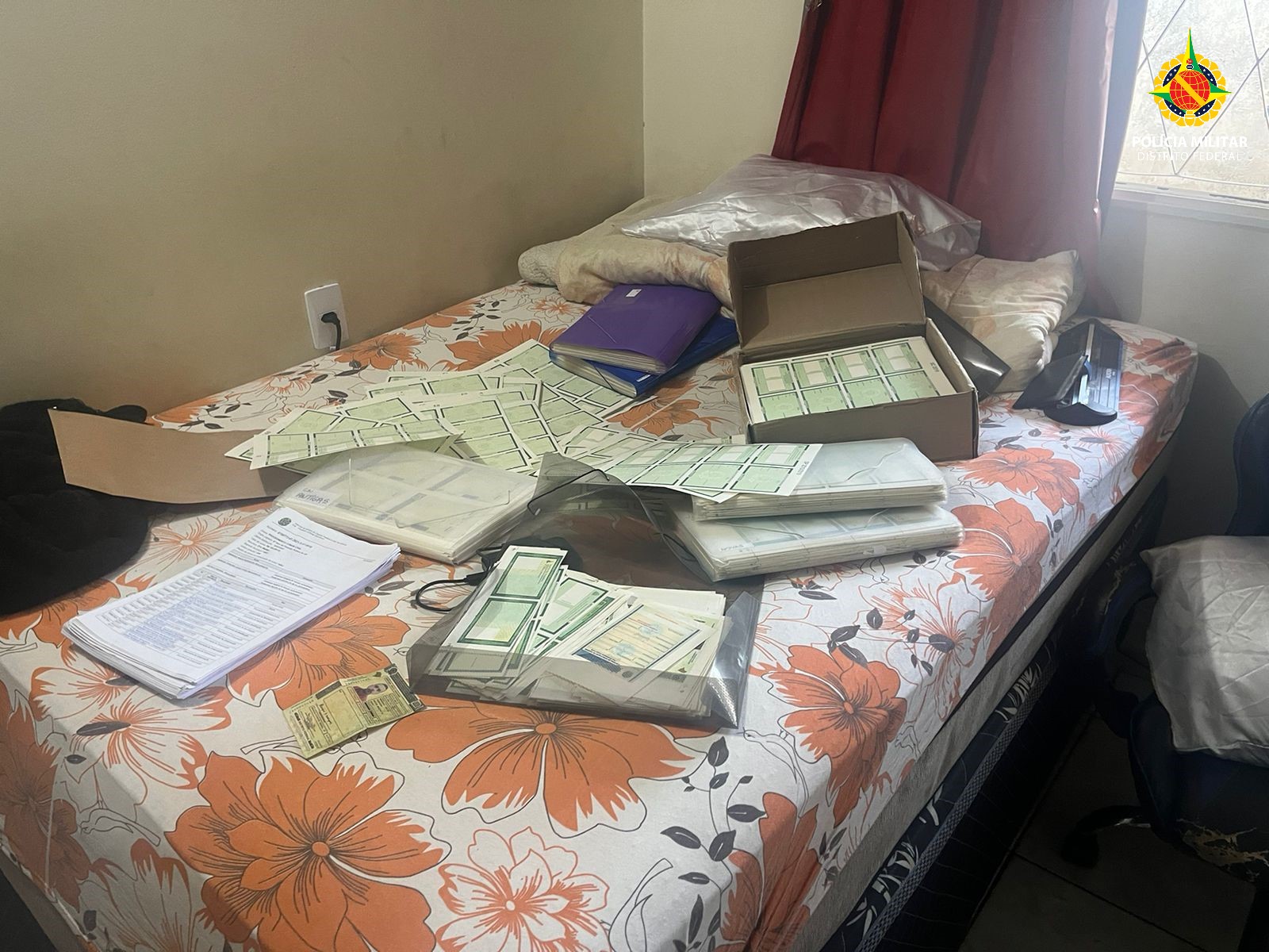 Policiais militares do 26º Batalhão apreenderam uma grande quantidade de cédulas para a fabricação de identidades falsas, além de maquinário para a produção do documento. A apreensão foi na tarde desta quinta-feira (21) no conjunto L da Quadra 206 de Santa Maria. Um homem foi preso.