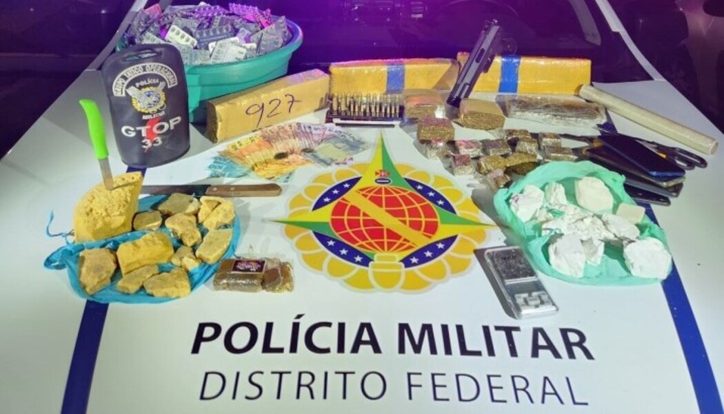 A PMDF ainda encontrou 10 munições de cal. 22, 02 munições de cal. 40, 10 munições de cal. 38 Super Alto +P, 01 simulacro (airsoft); 02 facas, tesoura, estilete, rolo de papel filme, balança de precisão, 04 celulares e R$ 1.150 reais em espécie.