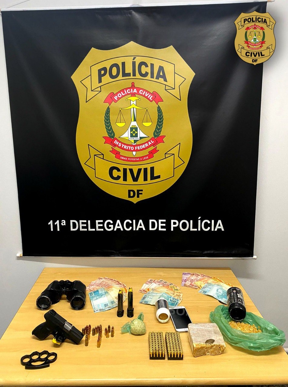 No momento da prisão, o criminoso guardava porções de crack, uma pistola Taurus G2C,128 munições, além de dinheiro em espécie dentro de um depósito.