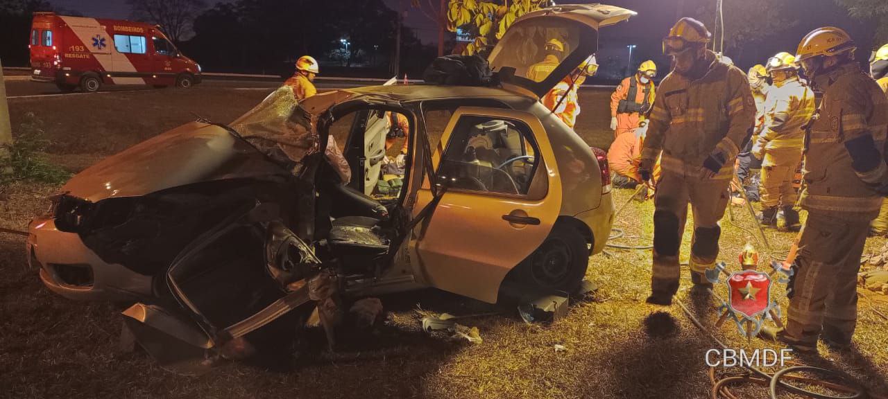 Segundo o Corpo de Bombeiros Militar do Distrito Federal (CBMDF), o carro ficou completamente destruído.