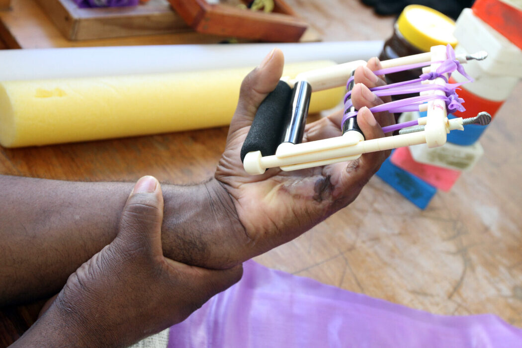 Em busca da recuperação da força nas mãos, Valmir Alves, 52 anos, se empenha semanalmente nas atividades passadas pela equipe. “Com a terapia, tudo se encaminha. Eu não andava; hoje, sim. Agora preciso melhorar a força na mão para retornar ao trabalho”. Ele é eletricista e sofreu um acidente de trabalho que causou as queimaduras e a internação de um mês e três dias: “Fui muito bem atendido por todas as equipes. Isso me acalmou, vinha até um psicólogo conversar com a gente”.