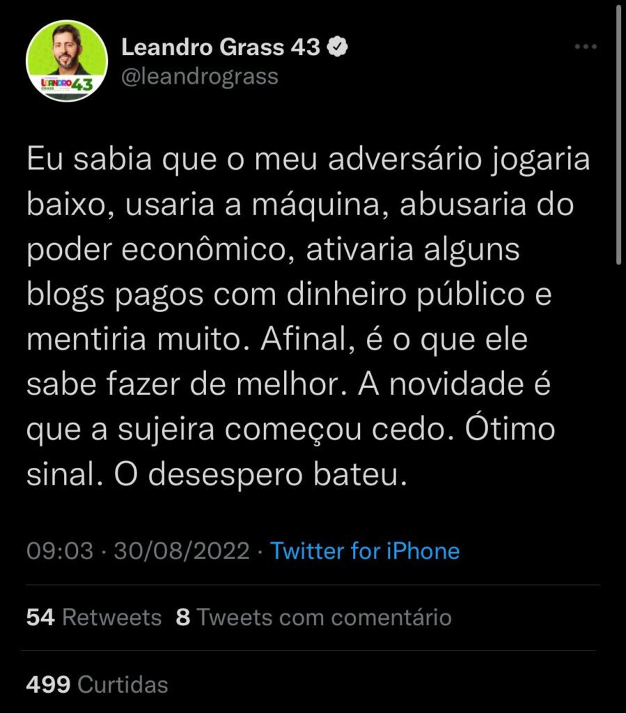 Ibaneis Rocha (MDB), atual governador e principal candidato à reeleição, apresentou uma notícia-crime em desfavor do candidato Leandro Grass por uma postagem em suas redes sociais. A publicação foi feita no Twitter, no dia 30 de agosto, quando o candidato do PV afirmou que ‘sabia que o adversário jogaria baixo’, entre outras coisas.