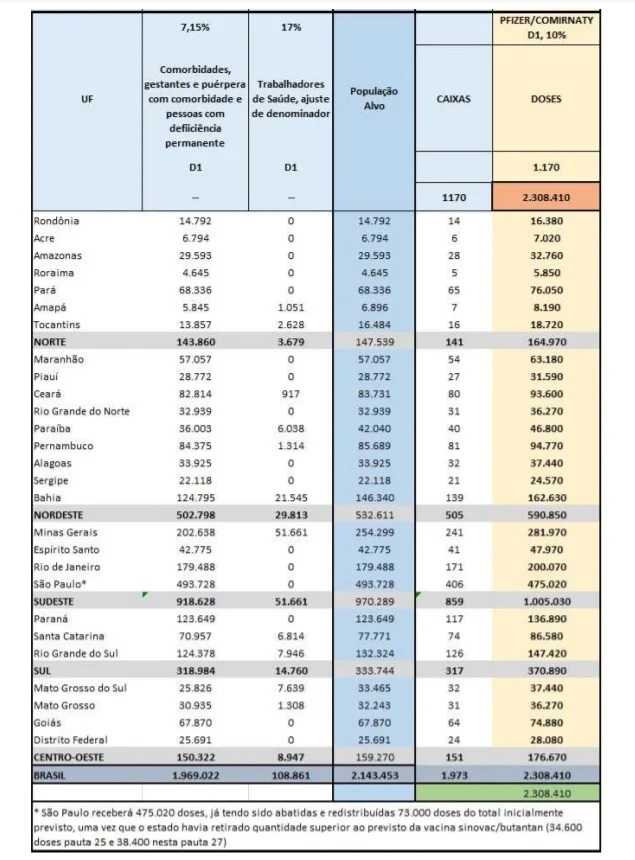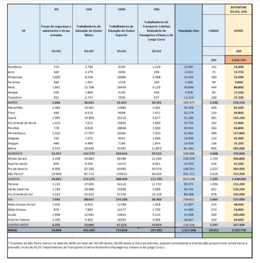 O Ministério da Saúde também irá distribuir 3,2 milhões de doses do Butantan e outras 2,3 milhões da Pfizer. Até setembro, a pasta pretende vacinar todo o público-alvo com a 1ª dose e até dezembro com a 2ª dose.