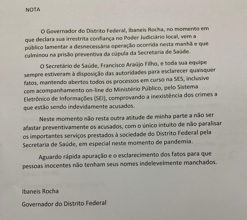 Horas após o secretário de Saúde do Distrito Federal, Francisco Araújo, ser preso em operação que apura fraudes na compra de testes de covid-19, o governador Ibaneis Rocha se manifestou a respeito. Ibaneis criticou a ação do Ministério Público (MPDFT) e classificou como “desnecessária” a operação.