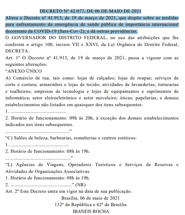 O governador do Distrito Federal, Ibaneis Rocha, assinou mais um decreto com os horários de funcionamento do comércio de rua, que passou a ser de 09h às 20h. Salões de beleza, barbearias, esmalterias, centros estéticos, agências de Viagens, Operadores Turísticos e Serviços de Reservas e atividades de Organizações Associativas poderão funcionar de 08h às 19h.