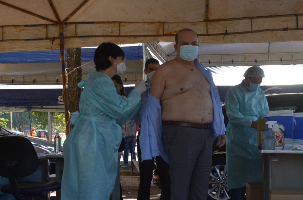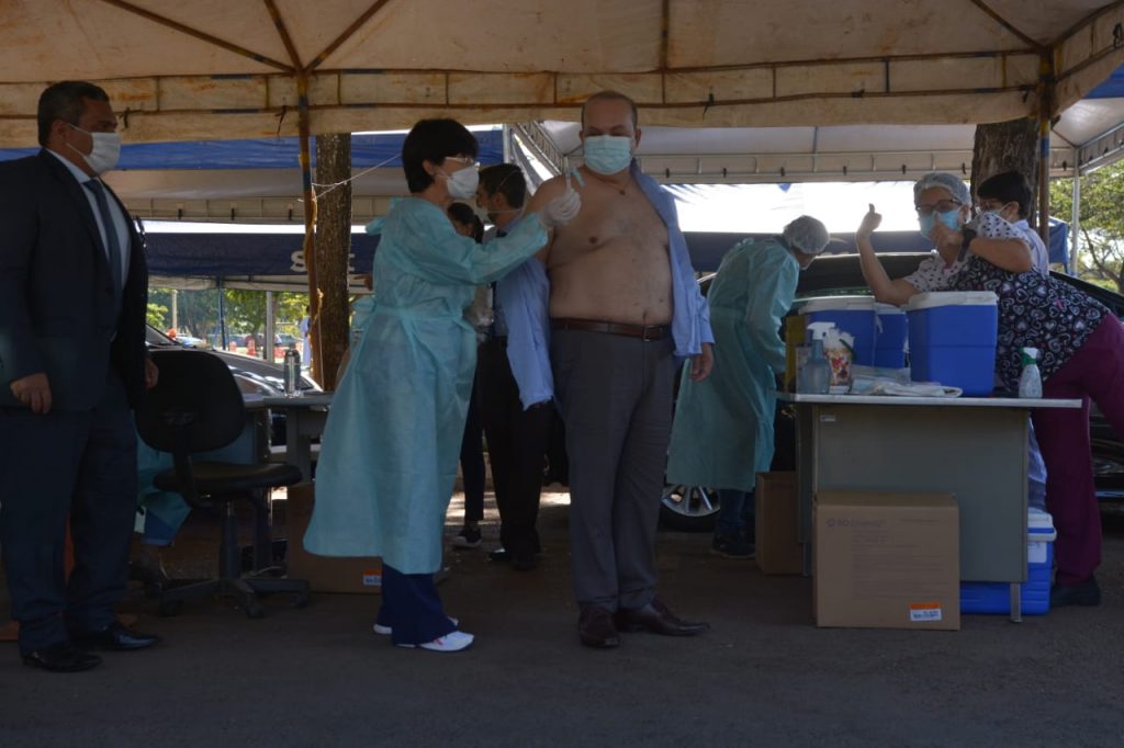 Na manhã desta quarta-feira (19), foi a vez do governador do DF, Ibaneis Rocha (MDB) tomar a primeira dose da vacina contra a Covid-19. O imunizante aplicado no governador é o do laboratório AstraZeneca. O mandatário integra o grupo prioritário de comorbidades. “Tenho 49 anos e sou diabético desde os 29 anos de idade. Consegui confirmar o agendamento e estou aqui como todo cidadão tem que fazer quando chegar a sua hora”, disse Ibaneis na fila da vacinação.