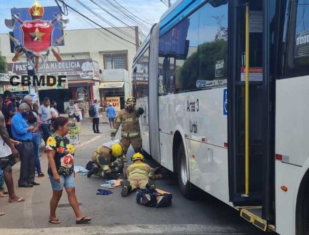 Segundo o Corpo de Bombeiros Militar do Distrito Federal (CBMDF), o homem ficou preso debaixo do ônibus e teve a perna esmagada.
