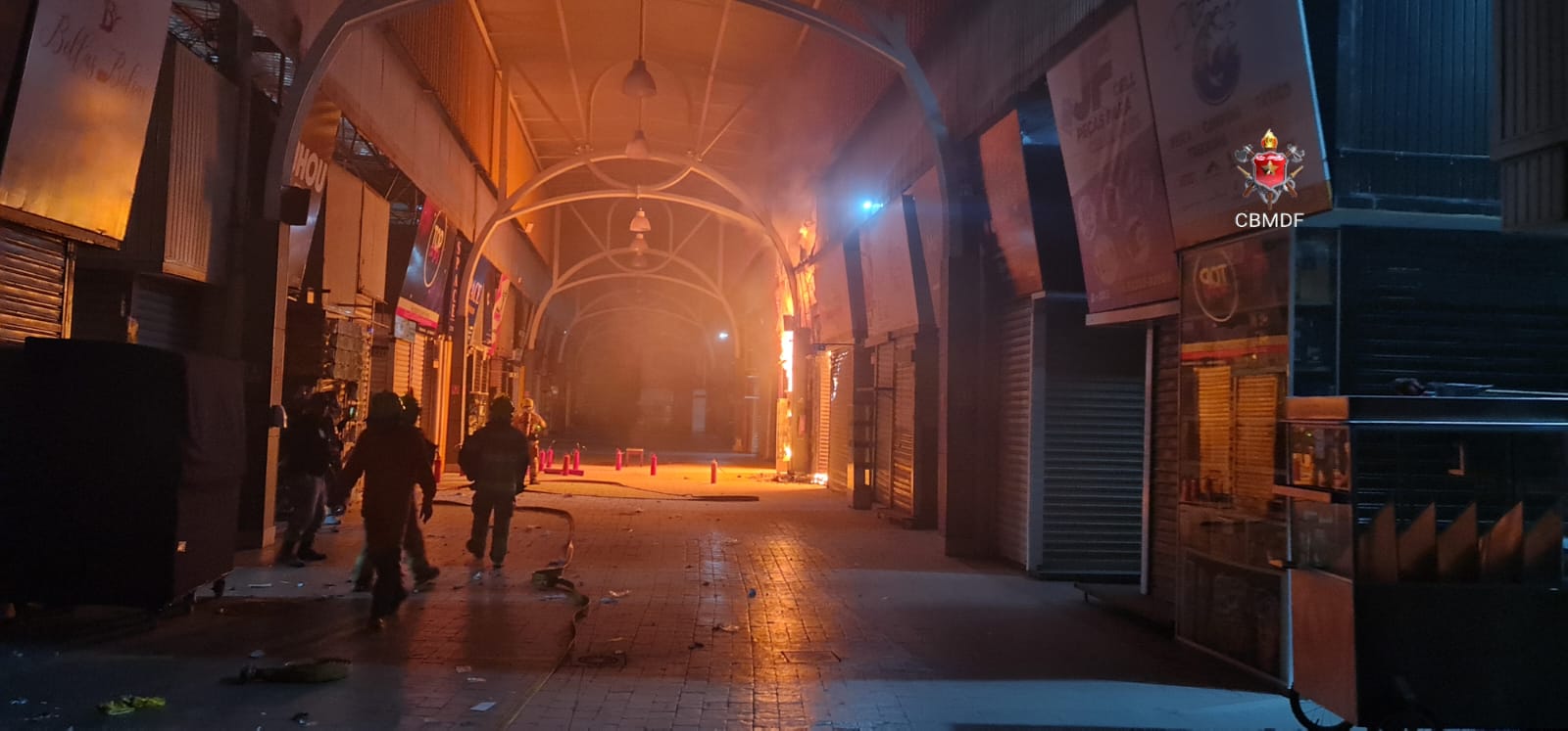 Os bombeiros se depararam com um considerável volume de fumaça escura saindo da estrutura do teto, na área central.