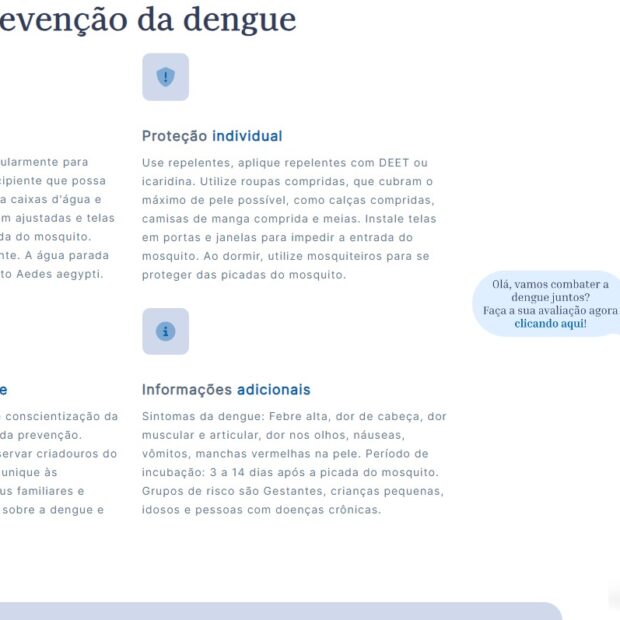 Apesar de não substituir uma triagem como a realizada pelos servidores da Saúde, o sistema permite conhecer os sintomas da dengue e até indicar possíveis sinais de agravamento. Destaque para a linguagem simples e o visual humanizado: a Manu veste um colete marrom, semelhante aos dos agentes de vigilância ambiental.