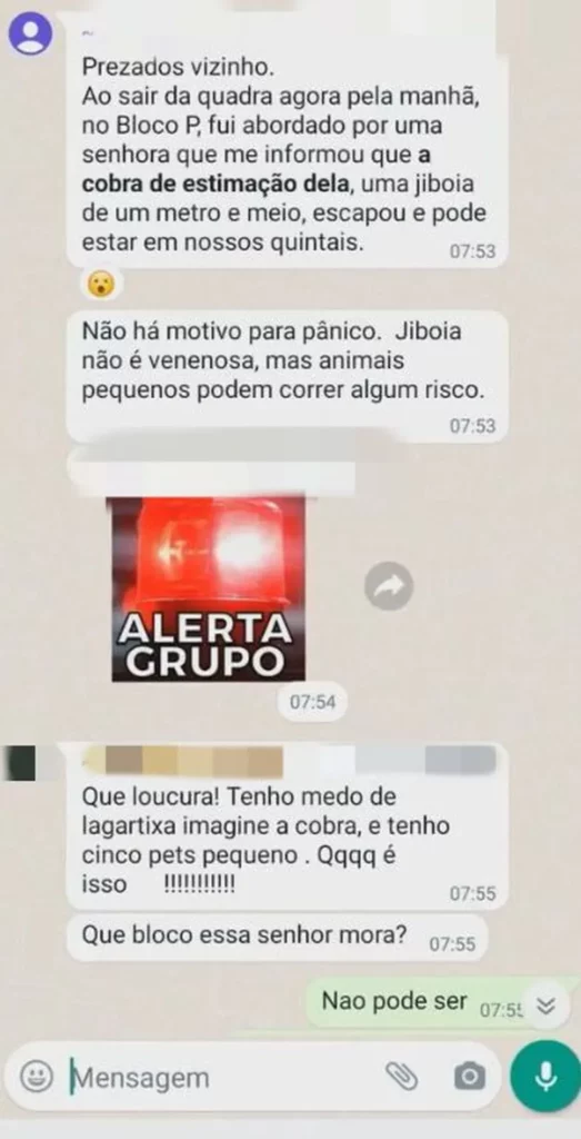 No entanto, um dos vizinhos alertou que, mesmo sendo um animal domesticado, a jiboia pode sentir-se ameaçada e representar risco a animais de pequeno porte na região. Em outro momento, uma vizinha compartilhou sua preocupação, mencionando que sua gata de estimação está presa em casa até que a jiboia seja encontrada.