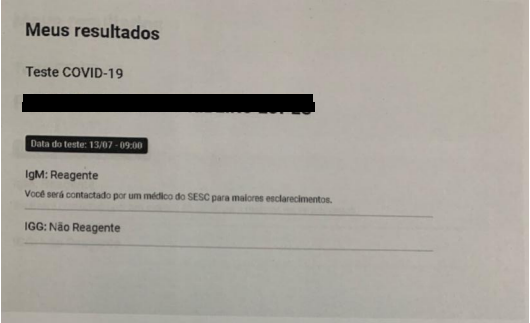 Em um dos resultados, o teste in vitro feito pelo Sesc, que detecta a resposta do sistema imunológico do possível infectado, classifica um comerciário de 37 anos como “IgM: Reagente”, o colocando como contaminado. Só que, dois dias depois, o trabalhador fez um novo exame no laboratório Diagnósticos do Brasil e o resultado para Covid-19 é claro: “Não detectado”.