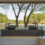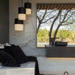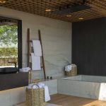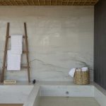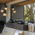 Adaptável para casas e apartamentos, o ambiente funciona como um refúgio para o morador para relaxar e se cuidar. Linhas retas, teto de treliça de madeira e conexão com a natureza compõem o Spa contemporâneo e acolhedor. Destaque para uma bancada em balanço com iluminação inferior, que parece flutuar. E ainda, uma escada de madeira como um módulo solto, usada como cabideiro e as cubas esculturais desenhadas por Jader Almeida.