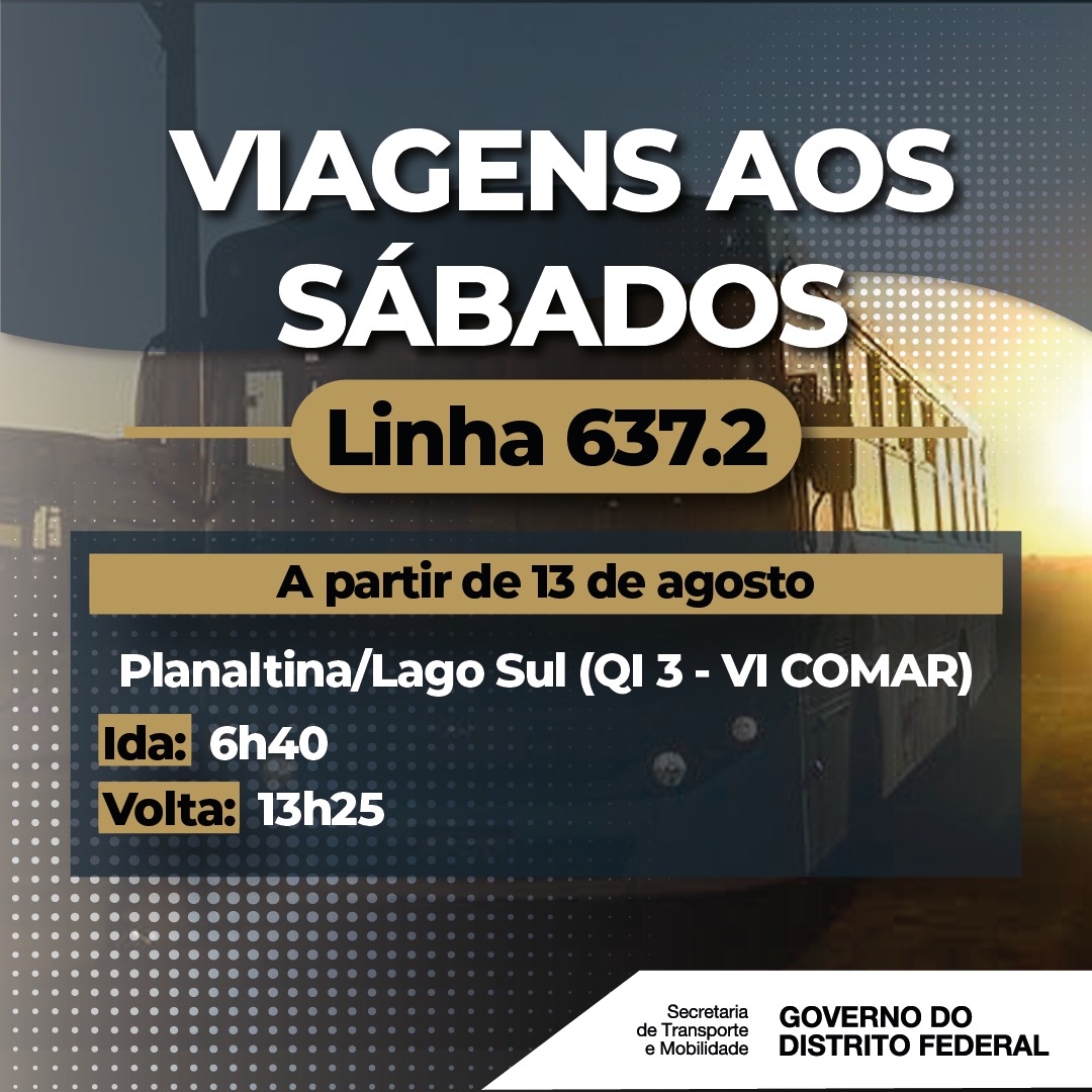 A partir deste sábado (13), a linha 637.2 de ônibus, terá viagens todos os sábados. Os transportes desta linha fazem o percurso entre Planaltina e o Comar VI, na QI 3 do Lago Sul e passam na área rural do DF.