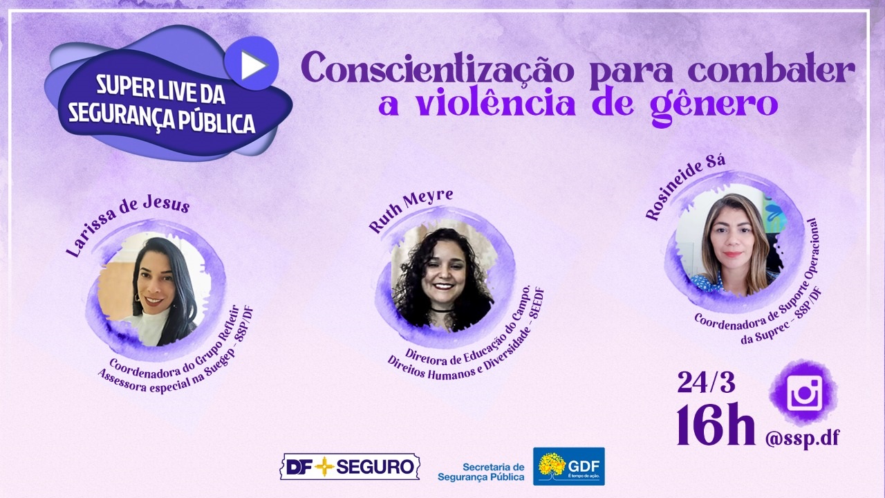 A Secretaria de Segurança Pública do DF (SSP) promove nesta quarta-feira (24) mais uma live sobre o Mês da Mulher: Conscientização para o combate da violência de gênero. No encontro, a discussão on-line será sobre as ações que fazem parte do programa Mulher Mais Segura, lançado neste mês pela pasta. A transmissão será realizada no perfil da SSP no Instagram, a partir das 16h.