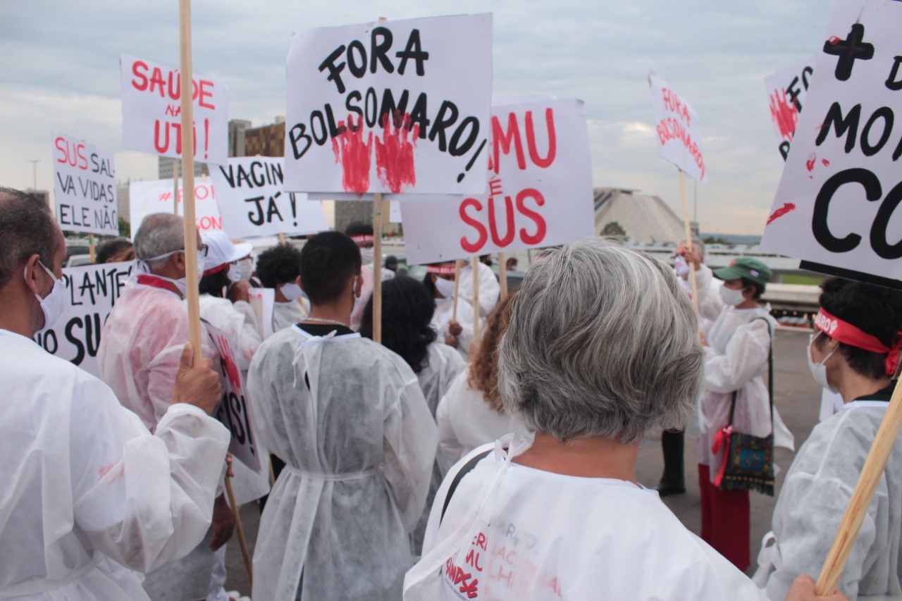 Com cartazes e faixas escritos #ForaBolsonaroeMourão e #EmdefesadoSUS, o ato foi feito para protestar contra as tentativas do governo de privatizar o Sistema Único de Saúde (SUS).