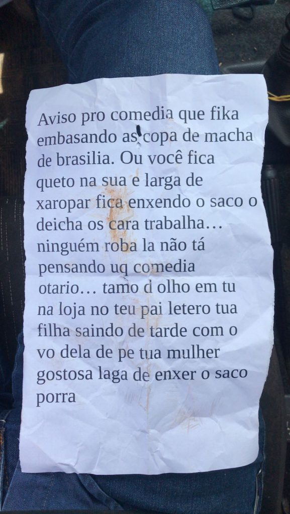 Para a uma compreensão melhor, a reportagem reescreveu o bilhete, corrigindo os erros mais graves de português, mas sem alterar a sua essência. No texto, o autor desconhecido mandava o seguinte recado: “Aviso pro comédia que fica embaçando as Copas das Machas de Brasília: ou você fica quieto na sua, e larga de xaropar, de ficar enchendo o saco, e deixa os caras trabalharem. Ninguém rouba lá não. Tá? Pensando o quê, comédia, otário? Estamos de olho em tu. Na loja do teu pai, (que é) leiteiro. Tua filha saindo de tarde com o avô dela (e) de pé… (sic)”.