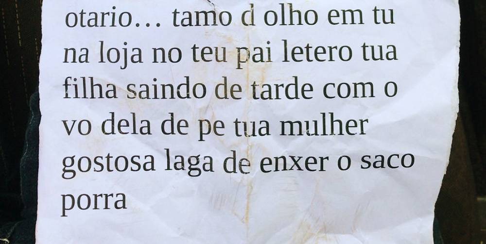 Mas a missiva, no entanto, não continha mensagens afetuosas nem declarações de amor. As palavras escritas nela soavam como uma ameaça a ele e à família. O texto parecia ter feito mal escrito de propósito. Como se a intenção do autor fosse mascarar algo, uma vez que os erros de português soavam tão forçados que dava a nítida impressão de que se tratava de alguém que sabia escrever, mas que não queria deixar sua digital para não ser reconhecido pela vítima.