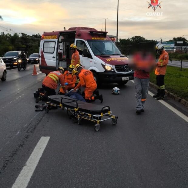 Um motociclista ficou ferido após uma colisão entre um carro e uma moto na manhã desta sexta-feira (23), em frente à Chácara 5, nas proximidades de uma floricultura, no Núcleo Bandeirante.