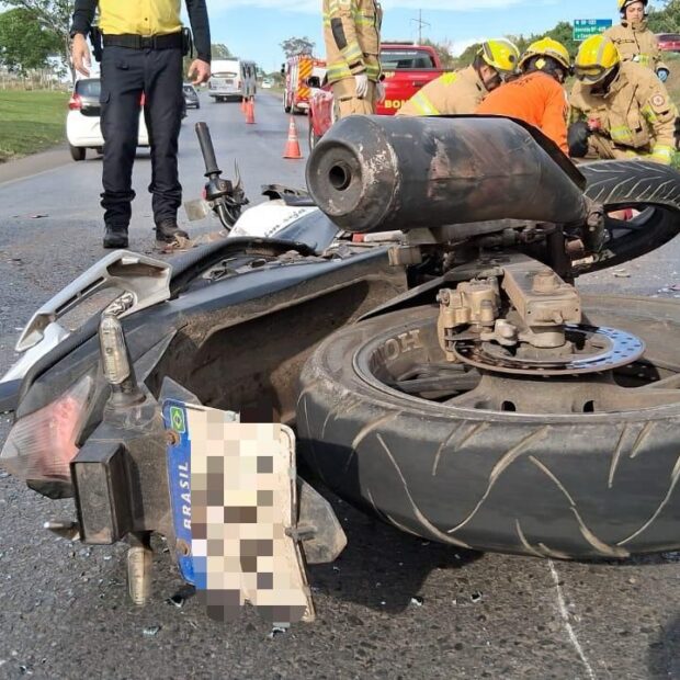 No local, as equipes encontraram um Fiat Palio Fire vermelho e uma Honda CB 250F Twister branca envolvidos no acidente.