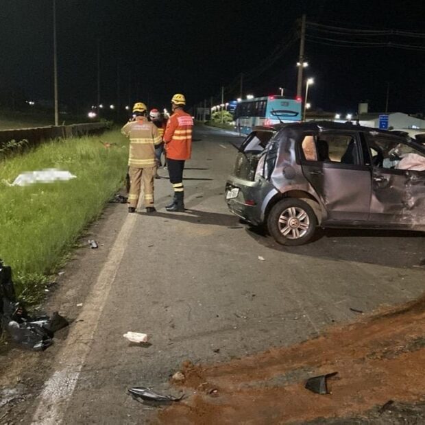 O Corpo de Bombeiros Militar do DF (CBMDF) foi acionado por volta das 22h51 e enviou três viaturas ao local. Ao chegarem, as equipes encontraram uma colisão envolvendo um carro modelo VW Up, de cor cinza, e uma motocicleta Honda vermelha.