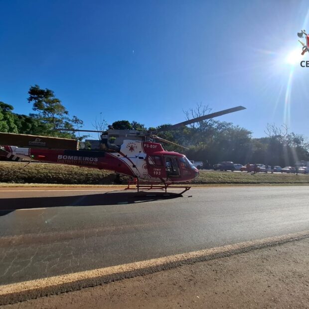 De acordo com os bombeiros, foi necessário aplicar um torniquete para conter a hemorragia antes de estabilizar o paciente. Consciente e orientado, ele foi transportado de helicóptero para o Instituto Hospital de Base do Distrito Federal (IHBDF).