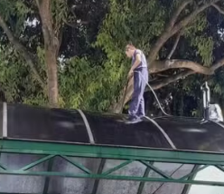 Nas imagens capturadas, é possível ver Sandra de Souza Marinho, de 41 anos, em cima de uma escada, utilizando um jato de água para limpar o toldo. Em um momento tenso, a escada escorrega no piso molhado, levando Sandra a cair de uma altura de cerca de 4 metros.