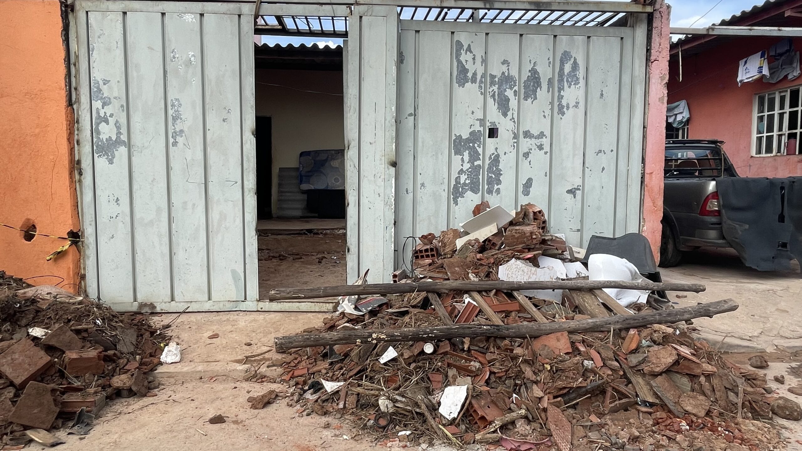 Devido às chuvas da última terça-feira (21), a auxiliar de limpeza Marilene Vogado Dias, 51 anos, teve sua casa completamente inundada na Chácara Santa Luzia, no Sol Nascente. Por volta das 15h, a enxurrada derrubou o muro da parte de trás da residência, o que fez com que a água invadisse e arrastasse tudo o que tinha dentro. Uma parede interna e o portão da casa também foram arrancados pela força da água.