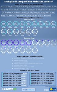 Do grupo de idosos, as faixas etárias com 70 anos ou mais já estão com a imunização completa na casa dos 100%. Daqueles com 65 a 69 anos, o recebimento da primeira dose atingiu 96,9% do público previsto, que é de 87.757 pessoas. Com a imunização completa, 94,92% dessa faixa foram vacinados.