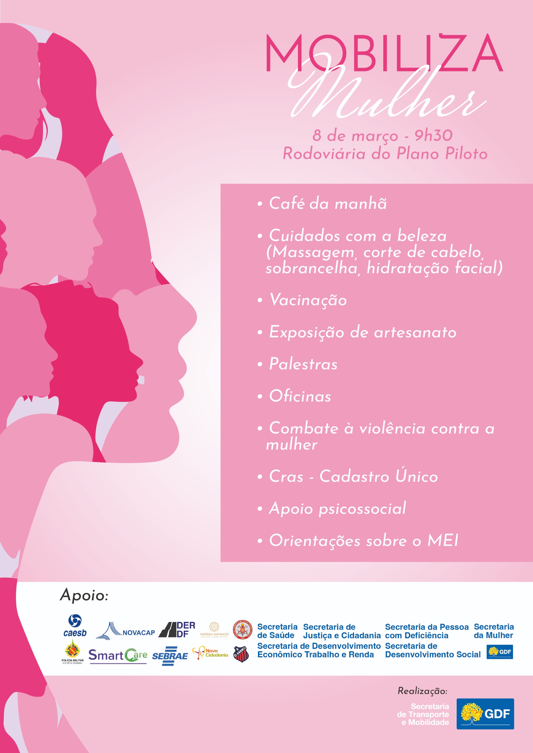 “A rodoviária é um dos pontos de maior circulação de pessoas, por onde passam diariamente milhares de mulheres do DF e do Entorno. Vamos aproveitar esse movimento para oferecer a elas uma gama de serviços do GDF, tanto para homenageá-las quanto para contribuir em suas atividades, na autoestima e nos cuidados com a saúde”, disse Zeno Gonçalves, titular da Secretaria de Transporte e Mobilidade (Semob).